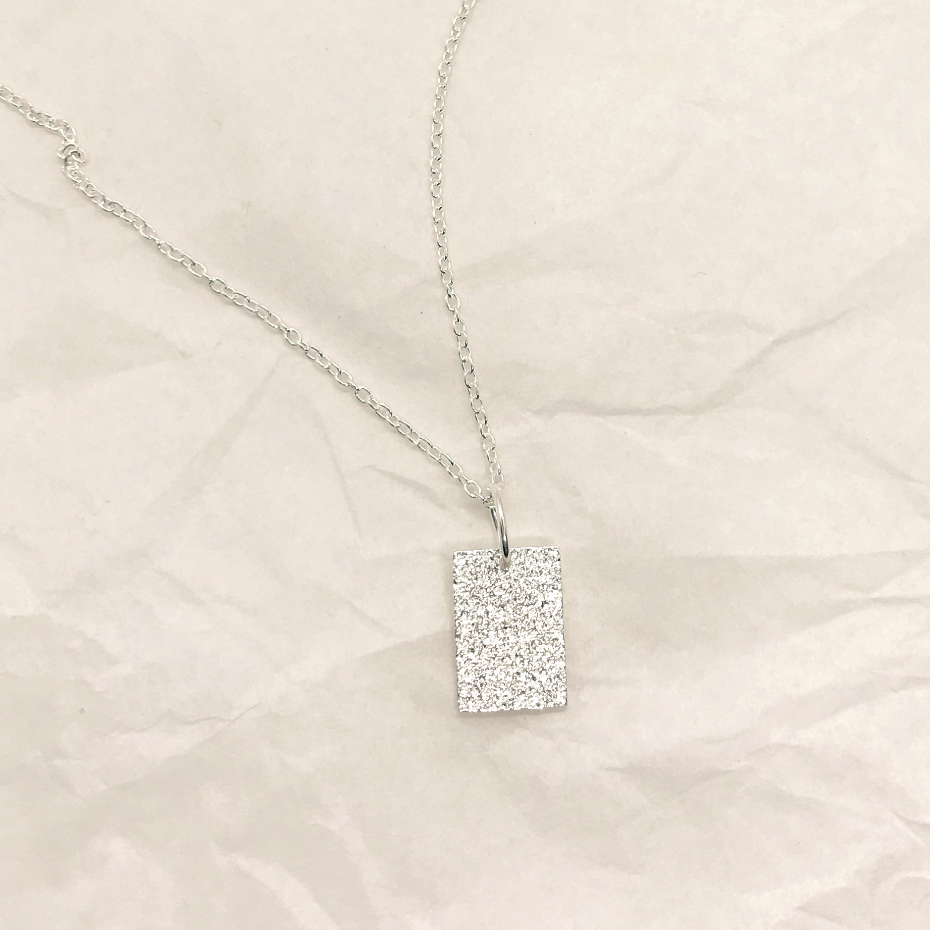An anchor chain necklace with a raw and cool pendant with a rocky surface. You can purchase this in silver or 18K gold plated silver. The back of the pendant is engraved with the Anita June logo and the 925 silver mark. A small Anita June logo tag is attached to the chain.