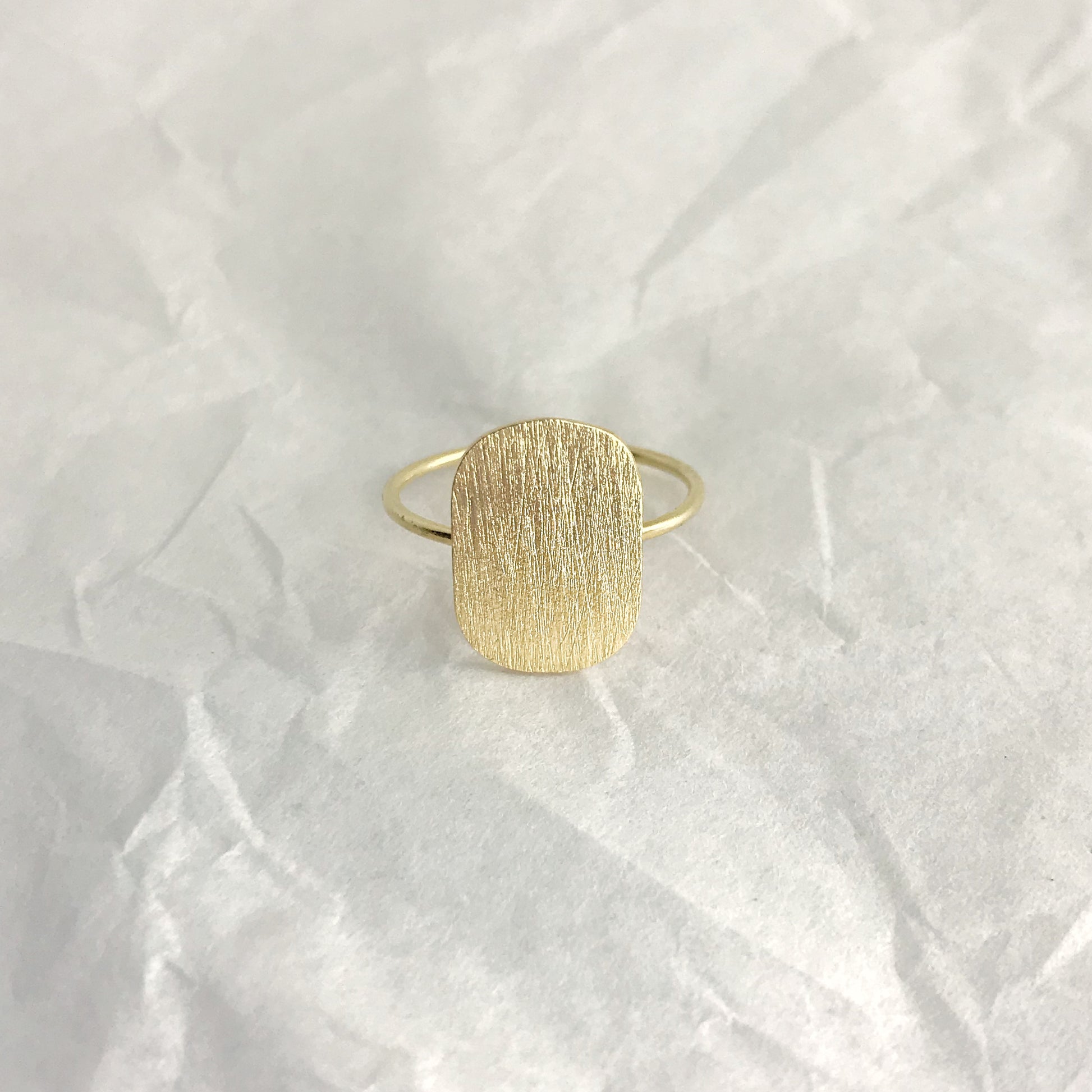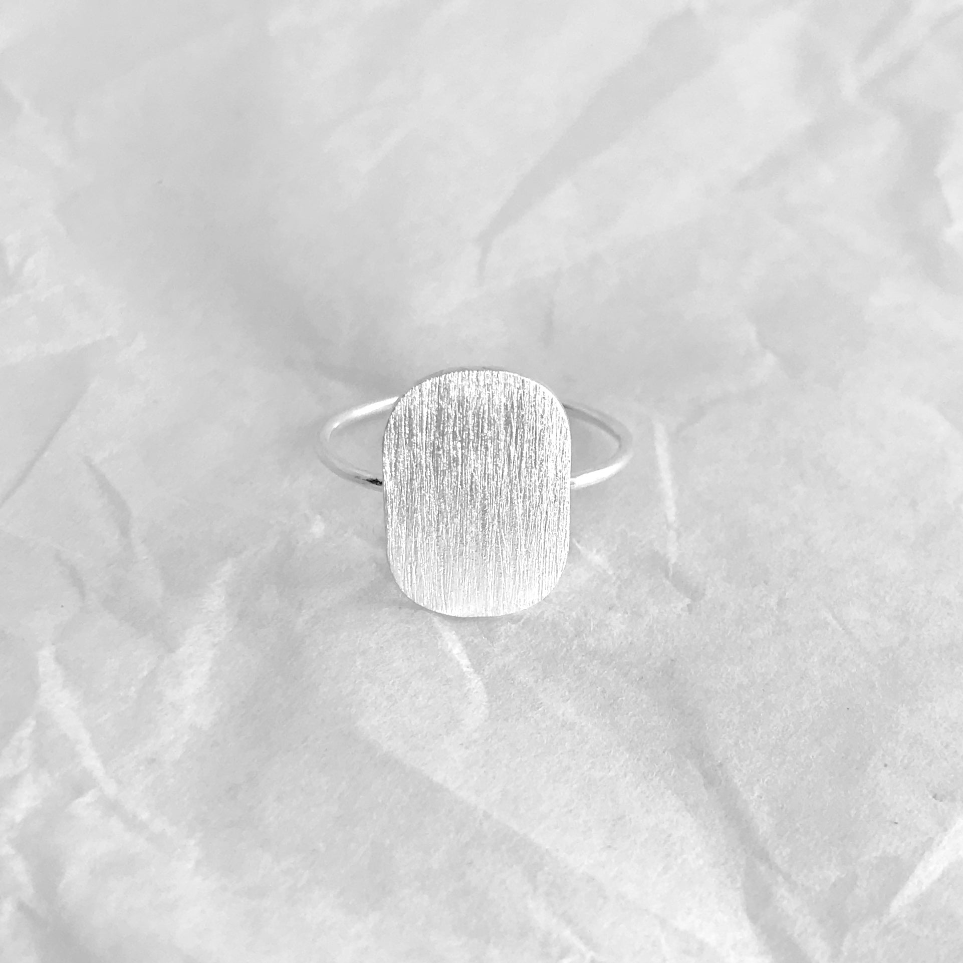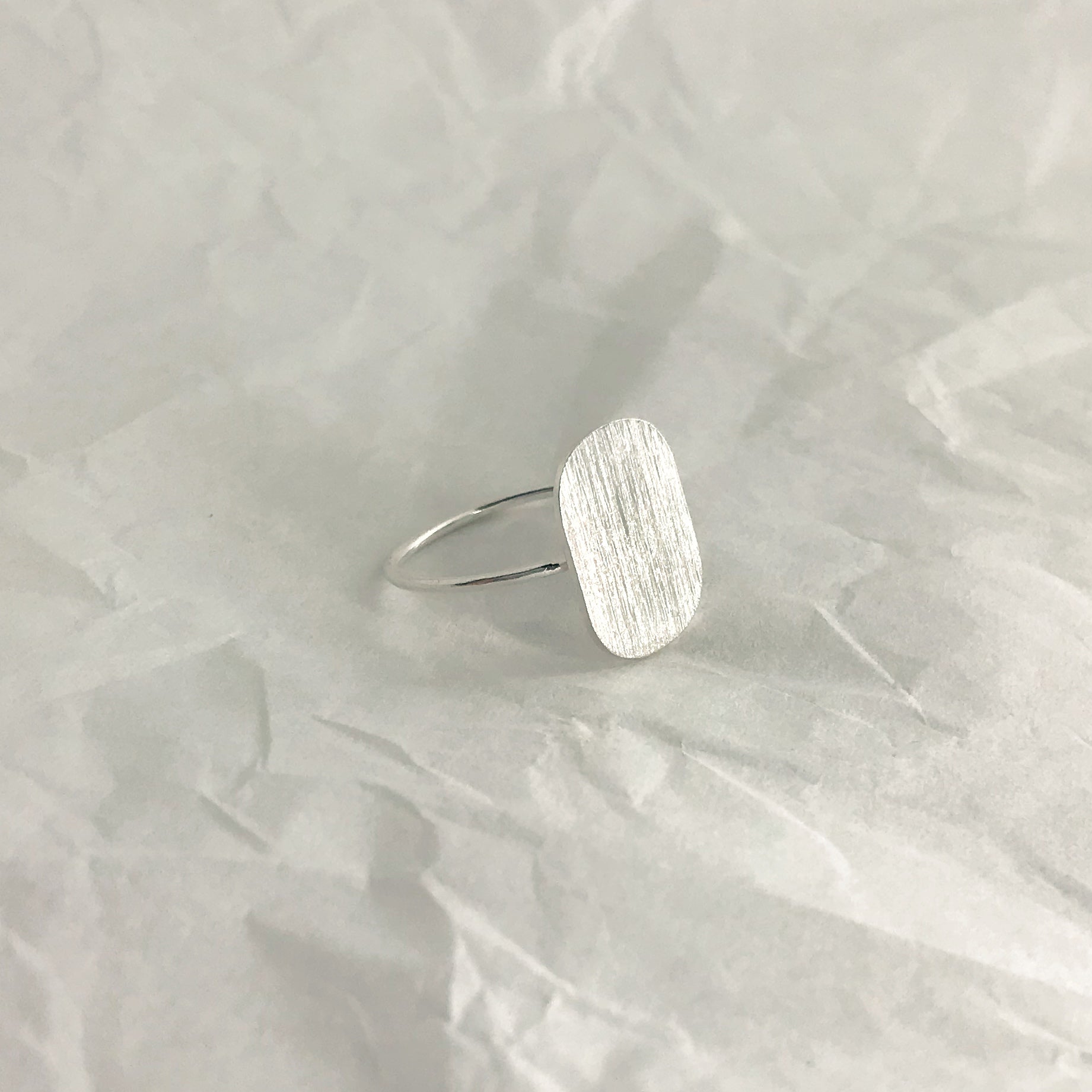 Simplicity and minimalism with a brushed surface. You can get this ring in either silver or 18K gold plated silver. The back of the oval form is engraved with the Anita June logo and the 925 silver mark.