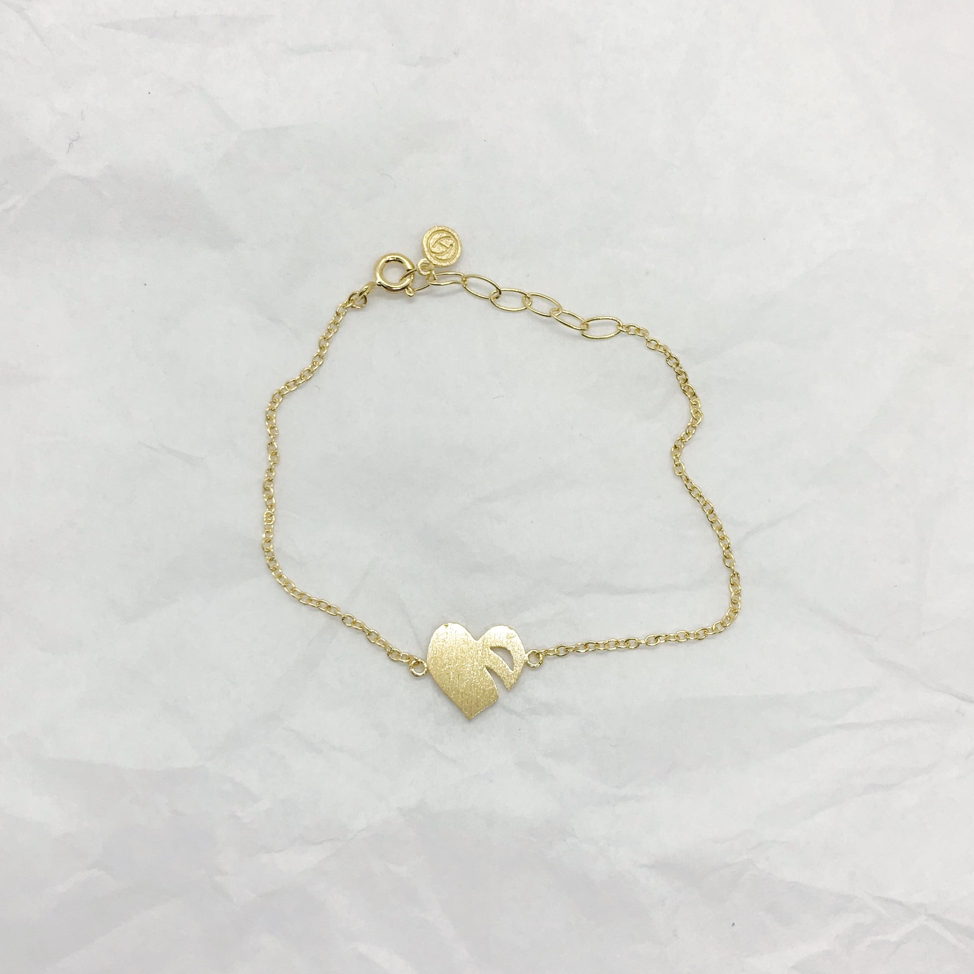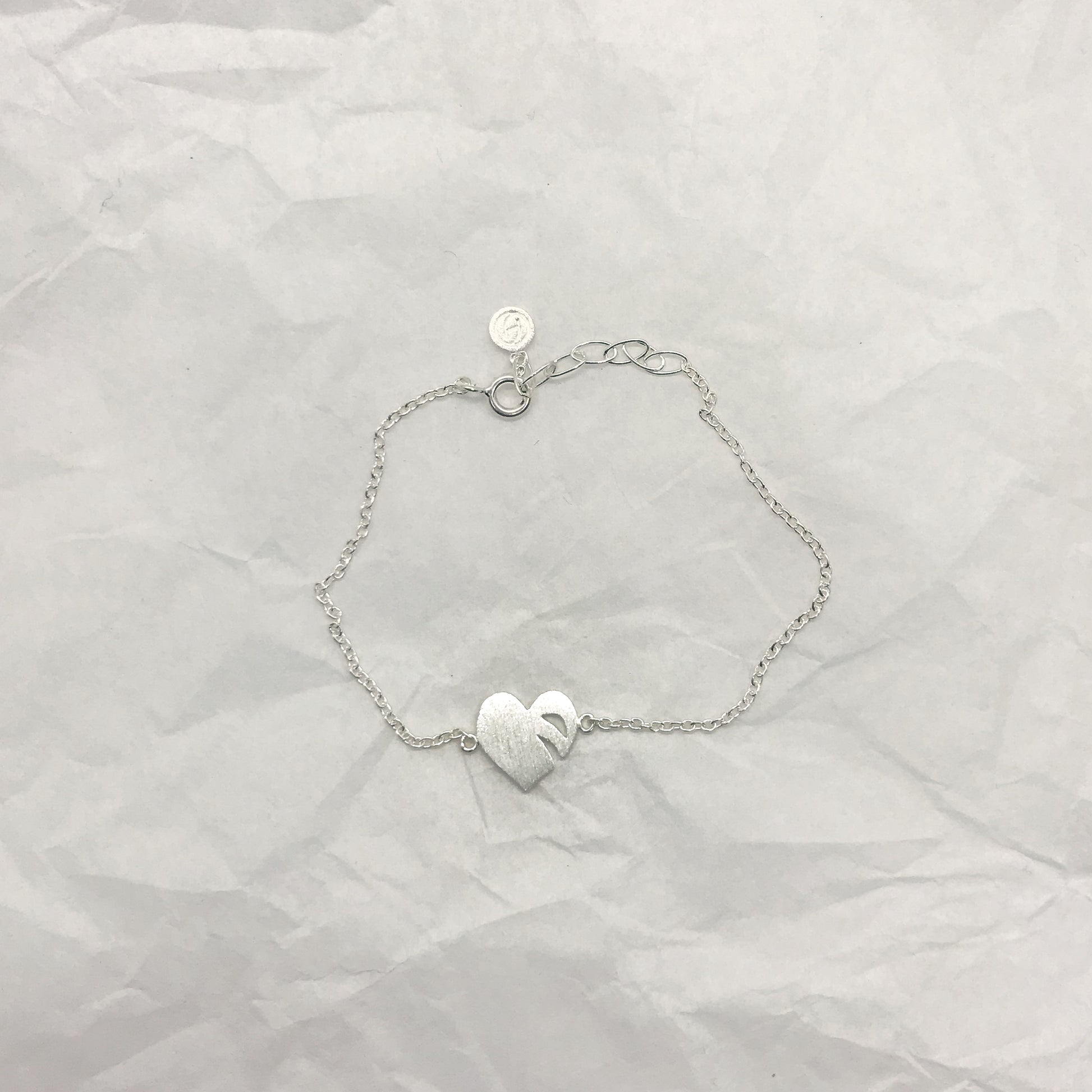 Anchor chain bracelet with a heart leaf pendant with a brushed surface. You can purchase this in silver or 18K gold plated silver. The back of the the leaf form is engraved with the Anita June logo and the 925 silver mark. A small Anita June logo tag is also attached to the chain.