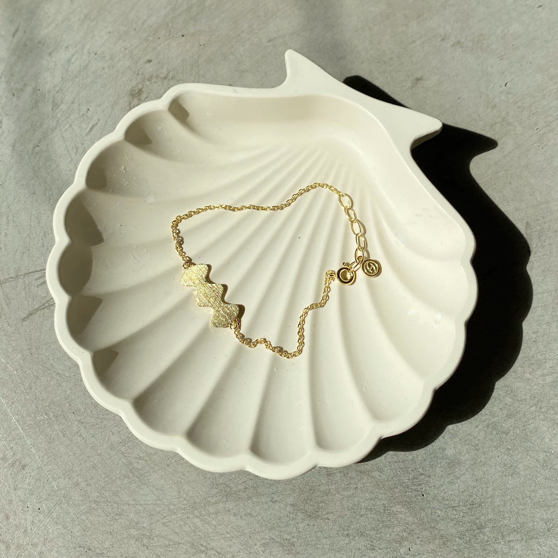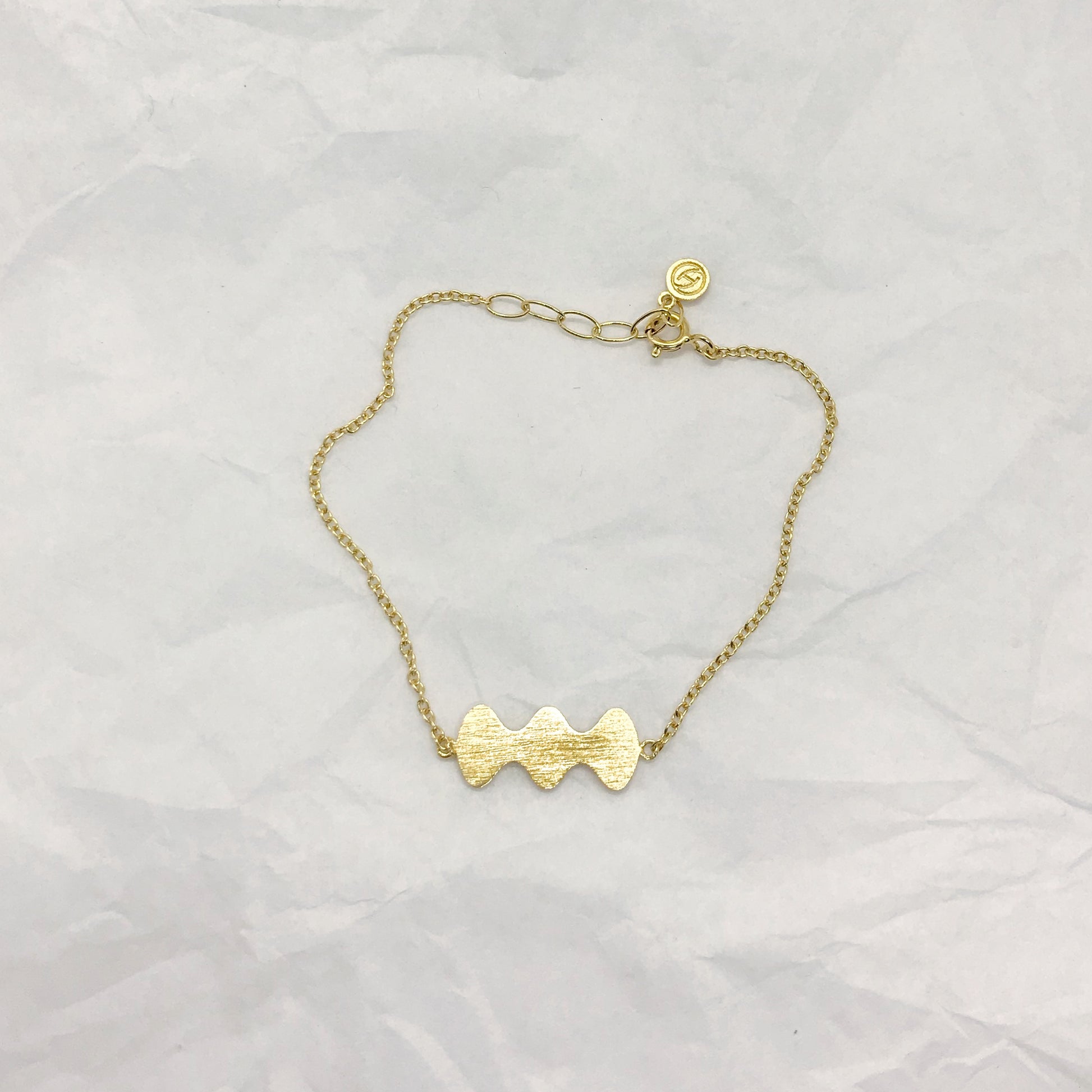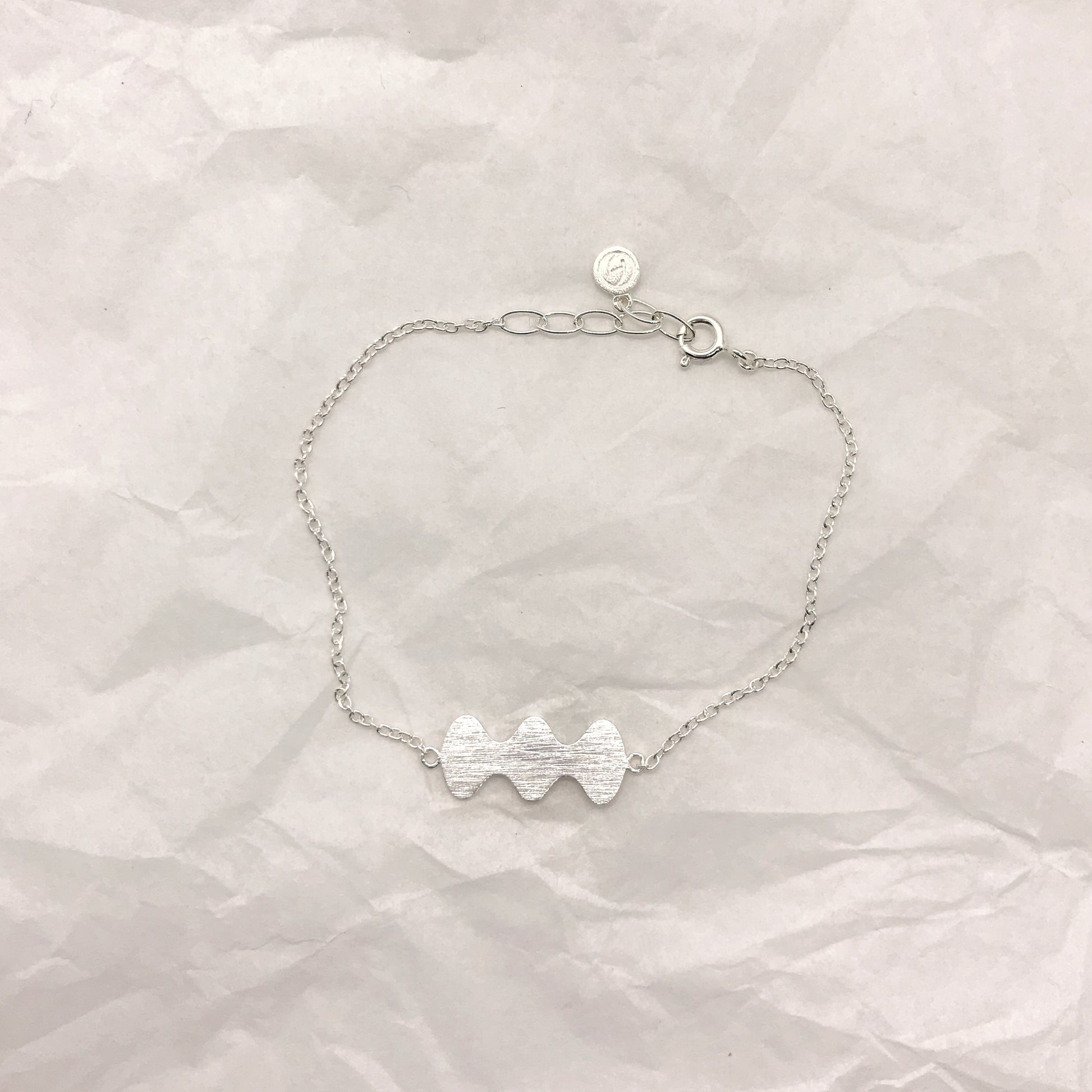 Anchor chain bracelet with a feminine wavy form with brushed surface. It is available in silver or 18K gold plated silver. On the back of the wavy form is our logo and the 925 silver mark. A small logo tag is also attached to the chain.